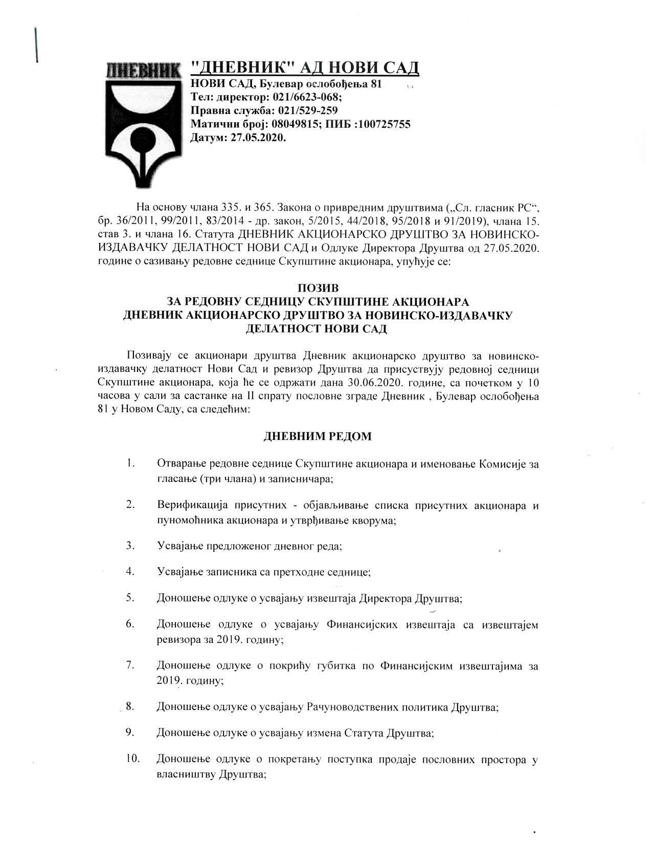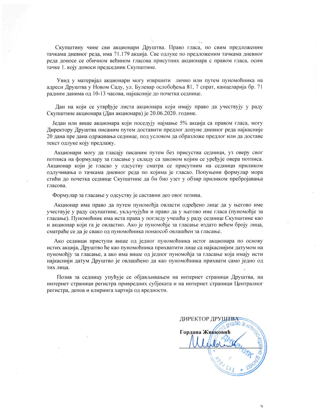 POZIV ZA REDOVNU SEDNICU SKUPŠTINE AKCIONARA