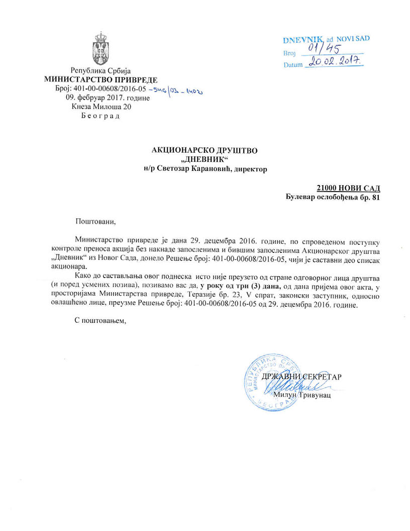 Povodom neistina koje se plasiraju, a tiču se preuzimanja Rešenja o prenosu kapitala na zaposlene, još jednom ukazujemo na to da je Nalog za preuzimanje Rešenja u Dnevniku zaprimljen dana 20.02.2017. godine i istim je direktoru ostavljen rok od 3 dana za njegovo preuzimanje. Direktor je ovo Rešenje preuzeo dana 22.02.2017. godine, dakle i pre ostavljenog roka nakon čega se odmah pristupilo upisu akcionara u Centralnom registru, čime su zaposleni i bivši zaposleni i zvanično postali vlasnici kapitala Dnevnika.